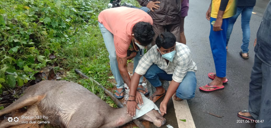ಬೆಳ್ತಂಗಡಿ: ಧರ್ಮಸ್ಥಳ ನೇತ್ರಾವತಿ ಸಮೀಪದಲ್ಲಿ ಜೂನ್ 17ರಂದು ಕಡವೆಯೊಂದು ವಾಹನಕ್ಕೆ ಡಿಕ್ಕಿ ಹೊಡೆದು ತೀವ್ರ ಗಾಯಗೊಂಡಿತ್ತು. ಇದನ್ನು ಗಮನಿಸಿದ ಶೌರ್ಯ ವಿಪತ್ತು ನಿರ್ವಹಣಾ ಘಟಕ ಧರ್ಮಸ್ಥಳದ ಧರ್ಮಸ್ಥಳ ವಲಯದ ಸ್ವಯಂಸೇವಕ ಸ್ನೇಕ್ ಪ್ರಕಾಶ್ ಸ್ಥಳೀಯರೊಂದಿಗೆ ಸೇರಿ ಪ್ರಥಮ ಚಿಕಿತ್ಸೆ ಒದಗಿಸಿದ್ದಾರೆ. ಬಳಿಕ ಅರಣ್ಯ ಇಲಾಖೆಯ ಸಿಬ್ಬಂದಿಗಳಿಗೆ ಮಾಹಿತಿ ರವಾನಿಸಿ, ಹೆಚ್ಚಿನ ಚಿಕಿತ್ಸೆಗಾಗಿ ಉಜಿರೆಯ ಪಶು ಆಸ್ಪತ್ರೆಗೆ ಕಡವೆಯನ್ನು ಸಾಗಿಸಿದ್ದಾರೆ. ಸ್ನೇಕ್ ಪ್ರಾಕಾಶ್ ಅವರ ಸಮಯಪ್ರಜ್ಞೆಯಿಂದ ಕಡವೆ ಪ್ರಾಣಾಪಾಯದಿಂದ ಪಾರಾಗಿದೆ.ವರದಿ : ಸ್ವಸ್ತಿಕ್ ಕನ್ಯಾಡಿ