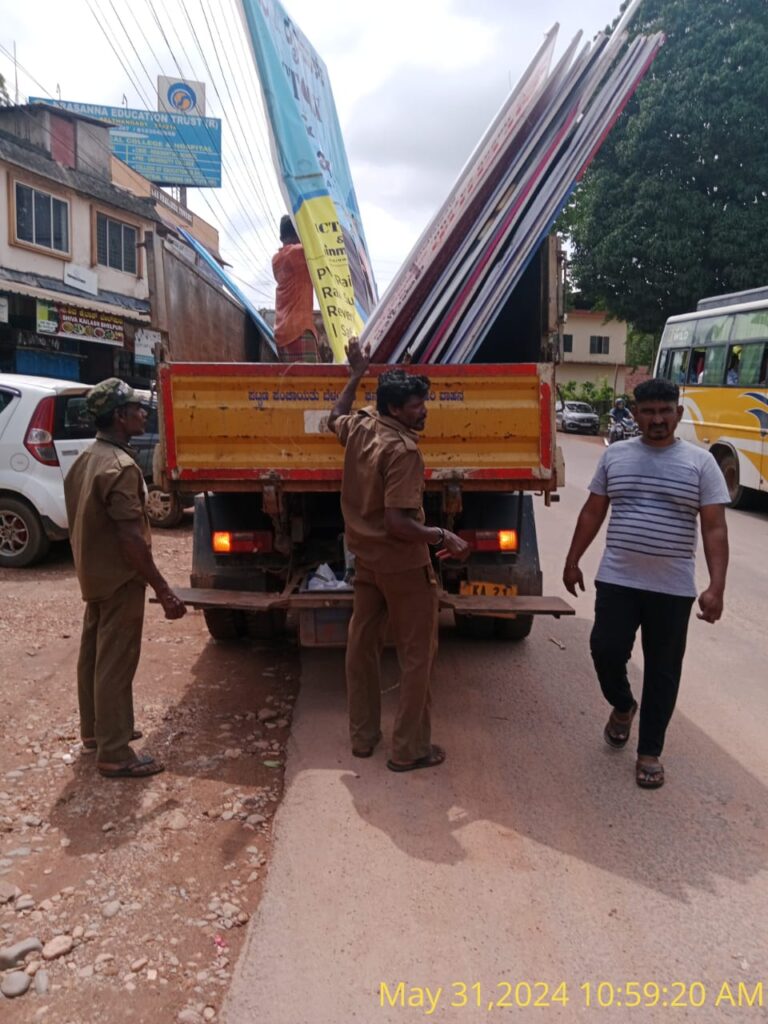 ಬೆಳ್ತಂಗಡಿ: ಬೆಳ್ತಂಗಡಿ ಪಟ್ಟಣ ಪಂಚಾಯತ್ ವ್ಯಾಪ್ತಿಯ ರಾಷ್ಟ್ರೀಯ ಹೆದ್ದಾರಿ ಬದಿಯಲ್ಲಿ ಪರವಾನಿಗೆ ಇಲ್ಲದೇ ಕಾನೂನುಬಾಹಿರವಾಗಿ ವಿದ್ಯುತ್ ಕಂಬಗಳನ್ನು ಬಳಸಿ ಅಪಾಯಕಾರಿಯಾಗಿ ಸಾಕಷ್ಟು ಫ್ಲೆಕ್ಸ್ಗಳನ್ನು ಅಳವಡಿಸಿರುವ ಬಗ್ಗೆ ಜೈಕನ್ನಡಮ್ಮ ನಿನ್ನೆಯಷ್ಟೇ (ಮೇ30) ವರದಿ ಮಾಡಿತ್ತು. ಸಾಮಾಜಿಕ ಕಾಳಜಿಯ ಈ ಜನಪರ ವರದಿಯಿಂದ ಎಚ್ಚೆತ್ತ ಬೆಳ್ತಂಗಡಿ ಪಟ್ಟಣ ಪಂಚಾಯತ್ ಆಡಳಿತಾಧಿಕಾರಿ, ಮುಖ್ಯಾಧಿಕಾರಿ ಮತ್ತು ಸಿಬ್ಬಂದಿವರ್ಗದವರು ಇಂದು (ಮೇ 31)ರಂದು ಬೆಳಿಗ್ಗೆಯೇ ಕಾರ್ಯಾಚರಣೆ ನಡೆಸಿ, ರಾಷ್ಟ್ರೀಯ ಹೆದ್ದಾರಿಯ ಬದಿಯಲ್ಲಿರುವ ಎಲ್ಲ ಅನಧಿಕೃತ ಫ್ಲೆಕ್ಸ್ಗಳನ್ನು ತೆರವುಗೊಳಿಸಿ, ಸೊತ್ತುಗಳನ್ನು ಮುಟ್ಟುಗೋಲು ಹಾಕಿಕೊಂಡಿದ್ದಾರೆ. ನಮ್ಮ ವರದಿಯಿಂದ ಮಾಹಿತಿ ಪಡೆದು ವರದಿಯ ಫಲಶ್ರುತಿಯೋ ಎಂಬಂತೆ ತಕ್ಷಣ ಕಾರ್ಯಾಚರಿಸಿದ ಬೆಳ್ತಂಗಡಿ ಪಟ್ಟಣ ಪಂಚಾಯತ್ನ ಅಧಿಕಾರಿಗಳು ಮತ್ತು ಸಿಬ್ಬಂದಿವರ್ಗದವರಿಗೆ ಅಭಿನಂದನೆಗಳು.ಕಾರ್ಯಾಂಗ ಕಾರ್ಯಾಚರಿಸಲು ಜನಪ್ರತಿನಿಧಿಗಳ ತೊಡರುಗಾಲು ಇಲ್ಲದಿದ್ದರೆ ಯಾವ ರೀತಿ ತಕ್ಷಣ ಕಾರ್ಯಪ್ರವೃತ್ತರಾಗಬಹುದು ಎಂಬುವುದಕ್ಕೆ ಬೆಳ್ತಂಗಡಿ ಪಟ್ಟಣ ಪಂಚಾಯತ್ನ ಇಂದಿನ ಕಾರ್ಯಾಚರಣೆ ಪ್ರತ್ಯಕ್ಷ ಉದಾಹರಣೆ. ಬೆಳ್ತಂಗಡಿ ಪಟ್ಟಣ ಪಂಚಾಯತ್ನ ಚುನಾಯಿತ ಆಡಳಿತ ಮಂಡಳಿ ವಸ್ತುಶಃ ಅಮಾನತಿನಲ್ಲಿರುವುದರಿಂದ ಇಲ್ಲಿ ಅಧಿಕಾರಿಗಳ ಕಾರ್ಯಕ್ಕೆ ಸದಸ್ಯರು ಅಡ್ಡಿಪಡಿಸುವಂತಿಲ್ಲ. ಇದರೊಂದಿಗೆ ಚುನಾವಣಾ ನೀತಿ ಸಂಹಿತೆ ಜಾರಿಯಲ್ಲಿ ಇರುವುದರಿಂದ ಶಾಸಕರ ಸಹಿತ ಯಾವೊಬ್ಬ ಜನಪ್ರತಿನಿಧಿಯೂ ಕಾರ್ಯಾಂಗದ ಕರ್ತವ್ಯದಲ್ಲಿ ಮೂಗು ತೂರಿಸುವಂತಿಲ್ಲ. ಅಧಿಕಾರಿಗಳಿಗೆ ಕಾನೂನಿನ ಚೌಕಟ್ಟಿನಲ್ಲಿ ಕರ್ತವ್ಯ ನಿರ್ವಹಿಸಲು ಯಾರ ಭಯವೂ ಇಲ್ಲ.