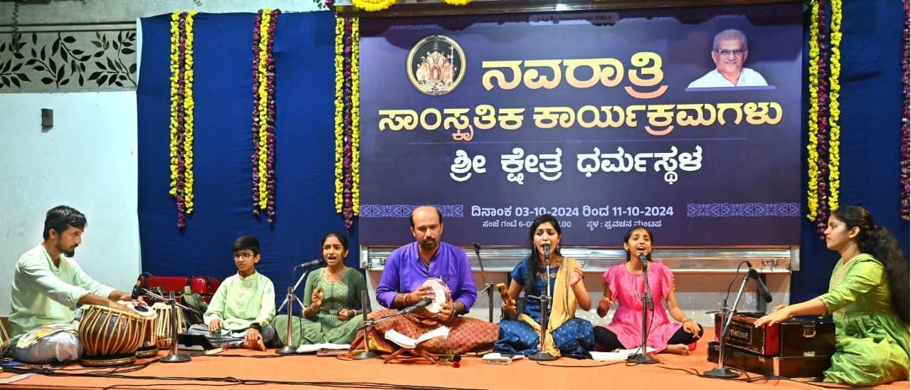 ಬೆಳ್ತಂಗಡಿ: ನವರಾತ್ರಿ ಶಭಾವಸರದಲ್ಲಿ ಆಕ್ಟೋಬರ್ 4ರಂದು ರಾತ್ರಿ ಧರ್ಮಸ್ಥಳದ ಪ್ರವಚನ ಮಂಟಪದಲ್ಲಿ ಪುತ್ತೂರಿನ ಗಾನಸಿರಿ ಕಲಾಕೇಂದ್ರದ ಡಾ. ಕಿರಣ್ಕುಮಾರ್ ಮತ್ತು ಬಳಗದವರು ಸಂಗೀತ ಕಾರ್ಯಕ್ರಮ ನೀಡಿದರು.ಶ್ರೀಲಕ್ಷೀ ಎಸ್., ಸೃಜನ ಪೂಜಾರಿ, ಮನಸ್ವಿ, ಅಚಿಂತ್ಯ ಸಹಕಲಾವಿದರಾಗಿ ಸಹಕರಿಸಿದರು.ತಬಲ ವಾದಕರಾಗಿ ಸುದರ್ಶನ ಆಚಾರ್ಯ, ಹಾರ್ಮೋನಿಯಂ ವಾದಕರಾಗಿ ದಿವ್ಯಾನಿಧಿ ರೈ ಸಹಕರಿಸಿದರು.