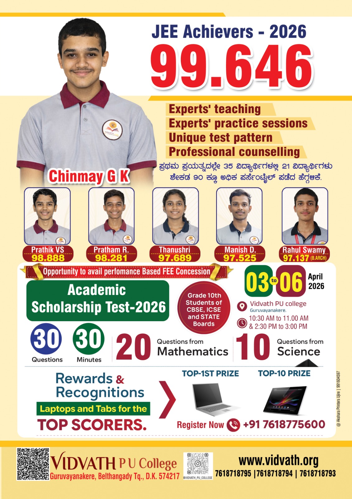 ಬೆಳ್ತಂಗಡಿ: ಎಸ್ಎಸ್ಎಲ್ಸಿ ಬಳಿಕ ಮುಂದೇನು ಎಂದು ವಿದ್ಯಾರ್ಥಿಗಳಲ್ಲಿ ಕಾಡುವ ಪ್ರಶ್ನೆಗೆ ಉತ್ತರ ಒದಗಿಸುವ ಸಲುವಾಗಿ; ಪ್ರಸ್ತುತ 10ನೇ ತರಗತಿಯಲ್ಲಿ ಅಧ್ಯಯನ ಮಾಡುತ್ತಿರುವ ವಿದ್ಯಾರ್ಥಿಗಳಿಗಾಗಿ ಗುರುವಾಯನಕೆರೆ ವಿದ್ವತ್ ಪದವಿಪೂರ್ವ ಕಾಲೇಜಿನಲ್ಲಿ ‘ಪ್ರತಿಭಾನ್ವೇಷಣೆ ಪರೀಕ್ಷೆ (Talent Test) ಹಾಗೂ ವೃತ್ತಿ ಮಾರ್ಗದರ್ಶನ ಶಿಬಿರ’ವನ್ನು ಏಪ್ರಿಲ್ 3 ರಿಂದ 6 ವರೆಗೆ ಹಮ್ಮಿಕೊಳ್ಳಲಾಗಿದೆ.ವಿದ್ಯಾರ್ಥಿಗಳು ತಮ್ಮ ಅನುಕೂಲಕರ ದಿನಗಳಲ್ಲಿ ಬಂದು ಪರೀಕ್ಷೆಯಲ್ಲಿ ಭಾಗವಹಿಸಲು ಅವಕಾಶ ಕಲ್ಪಿಸುವ ಸಲುವಾಗಿ ನಾಲ್ಕು ದಿನಗಳ ಕಾಲ ಪರೀಕ್ಷೆಯನ್ನು ಆಯೋಜಿಸಲಾಗಿದೆ.ಪರೀಕ್ಷೆಗೆ ಪ್ರವೇಶ ಸಂಪೂರ್ಣ ಉಚಿತವಾಗಿದ್ದು, ಪ್ರತಿದಿನ ಬೆಳಗ್ಗೆ 10.30 ರಿಂದ 11 ಗಂಟೆವರೆಗೆ ಹಾಗೂ ಮಧ್ಯಾಹ್ನ 2.30 ರಿಂದ 3.00 ರವರೆಗೆ ಗುರುವಾಯನಕೆರೆ ವಿದ್ವತ್ ಪದವಿಪೂರ್ವ ಕಾಲೇಜಿನ ಕ್ಯಾಂಪಸ್ನಲ್ಲಿ ಪರೀಕ್ಷೆ ಆಯೋಜಿಸಲಿದೆ. ಈ ಪರೀಕ್ಷೆಯಲ್ಲಿ ವಿಜ್ಞಾನ (Science) ವಿಭಾಗದಿಂದ 10 ಹಾಗೂ ಗಣಿತ (Mathematics) ವಿಭಾಗದಿಂದ 20 ಪ್ರಶ್ನೆಗಳಿರಲಿವೆ. ಪರೀಕ್ಷೆ ಅವಧಿ 30 ನಿಮಿಷಗಳಾಗಿದ್ದು; ಈ ಮೂಲಕ ವಿದ್ಯಾರ್ಥಿಗಳು ತಮ್ಮ ಪ್ರತಿಭೆಯನ್ನು ಪ್ರದರ್ಶಿಸಲು ಉತ್ತಮ ವೇದಿಕೆ ಕಲ್ಪಿಸಲಾಗಿದೆ.ಪರೀಕ್ಷೆಯಲ್ಲಿ ಅತಿ ಹೆಚ್ಚು ಅಂಕ ಗಳಿಸಿದ ವಿದ್ಯಾರ್ಥಿಗಳಿಗೆ ವಿಶೇಷ ಬಹುಮಾನವಾಗಿ ಲ್ಯಾಪ್ಟಾಪ್ ನೀಡಲಾಗುವುದು. ಗಮನಾರ್ಹ ಸಾಧನೆ ಮಾಡಿದ ವಿಜೇತರಿಗೆ ಟ್ಯಾಬ್ಗಳು ಬಹುಮಾನವಾಗಿ ನೀಡಲಾಗುತ್ತದೆ. ಕಾಲೇಜಿಗೆ ಪ್ರವೇಶ ಪಡೆಯಲು ಬಯಸುವ ವಿದ್ಯಾರ್ಥಿಗಳಿಗೆ, ಪ್ರತಿಭಾ ಪರೀಕ್ಷೆಯಲ್ಲಿ ಪಡೆಯುವ ಅಂಕದ ಮೇರೆಗೆ, ವಿಶೇಷ ವಿದ್ಯಾರ್ಥಿ ವೇತನದ ಅವಕಾಶವನ್ನು ಕಲ್ಪಿಸಲಾಗಿದ್ದು; ವಿದ್ಯಾರ್ಥಿಗಳು ಇದರ ಪ್ರಯೋಜನವನ್ನು ಪಡೆಯುವಂತೆ ತಿಳಿಸಲಾಗಿದೆ. ನೋಂದಣಿಗಾಗಿ 7618775600 ಸಂಖ್ಯೆಯನ್ನು ಸಂಪರ್ಕಿಸುವಂತೆ ಸಂಸ್ಥೆಯ ಅಧ್ಯಕ್ಷ ಸುಭಾಶ್ಚಂದ್ರ ಶೆಟ್ಟಿ ಪ್ರಕಟಣೆಯಲ್ಲಿ ತಿಳಿಸಿದ್ದಾರೆ.